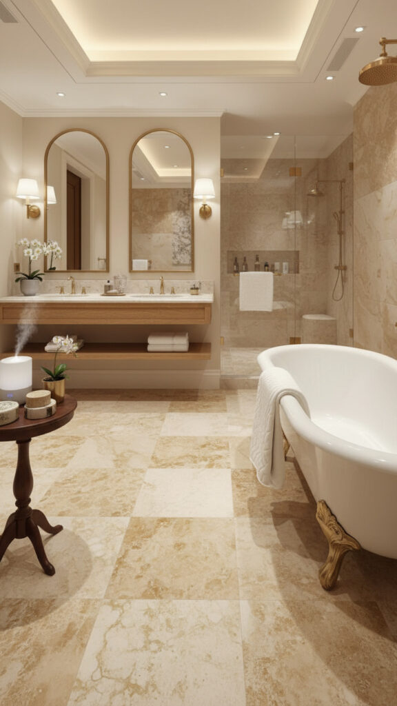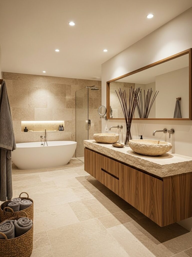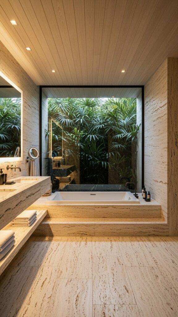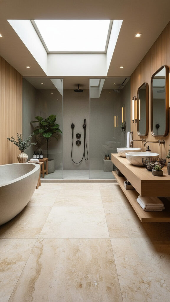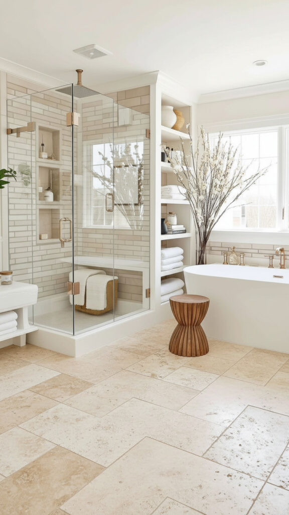 - Floor-to-Ceiling Tile: Large format marble or travertine.