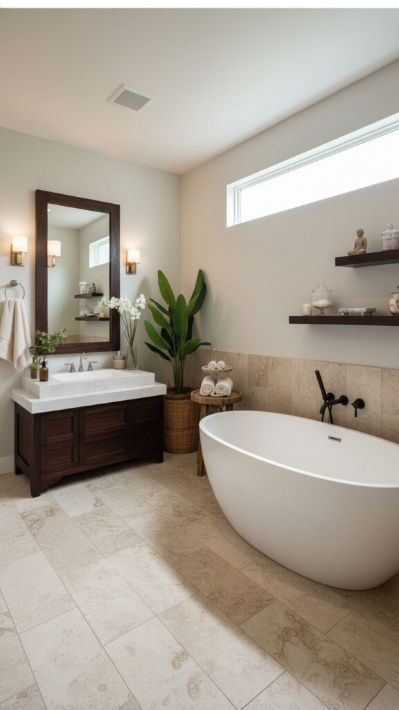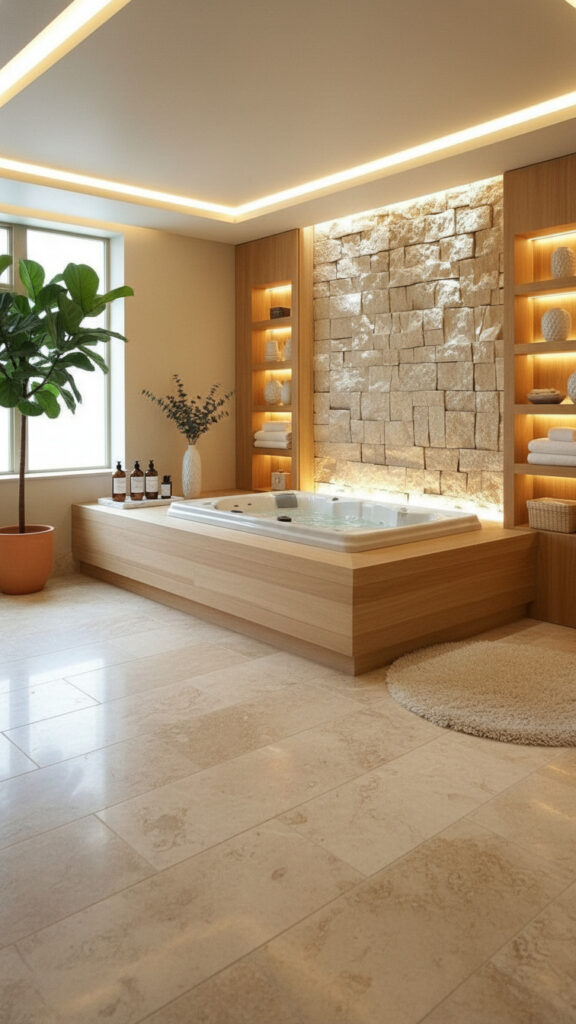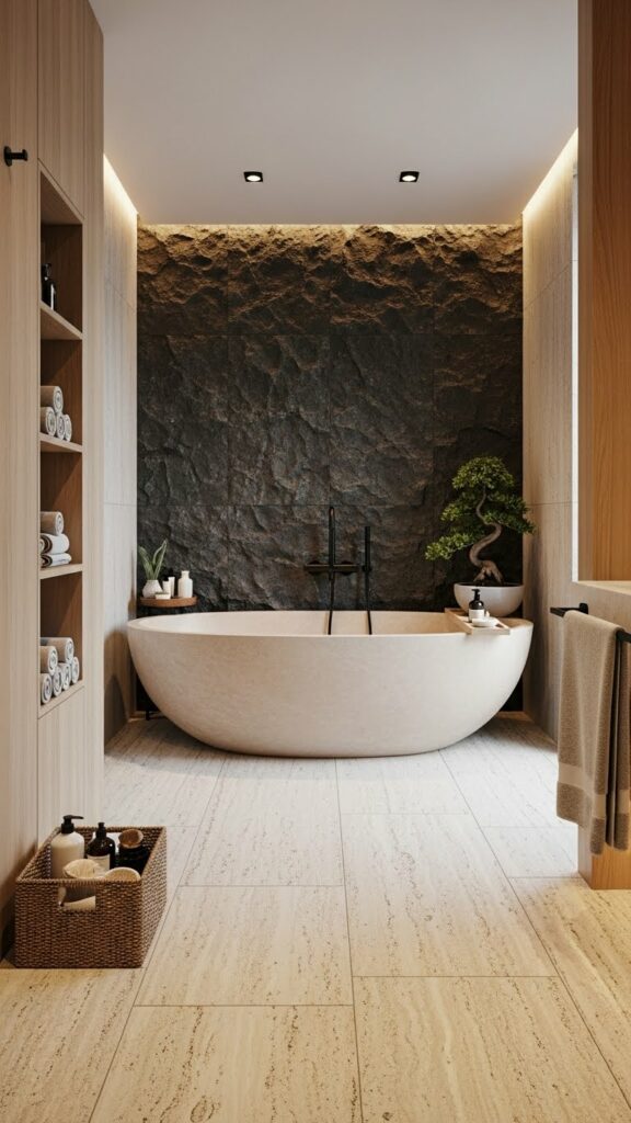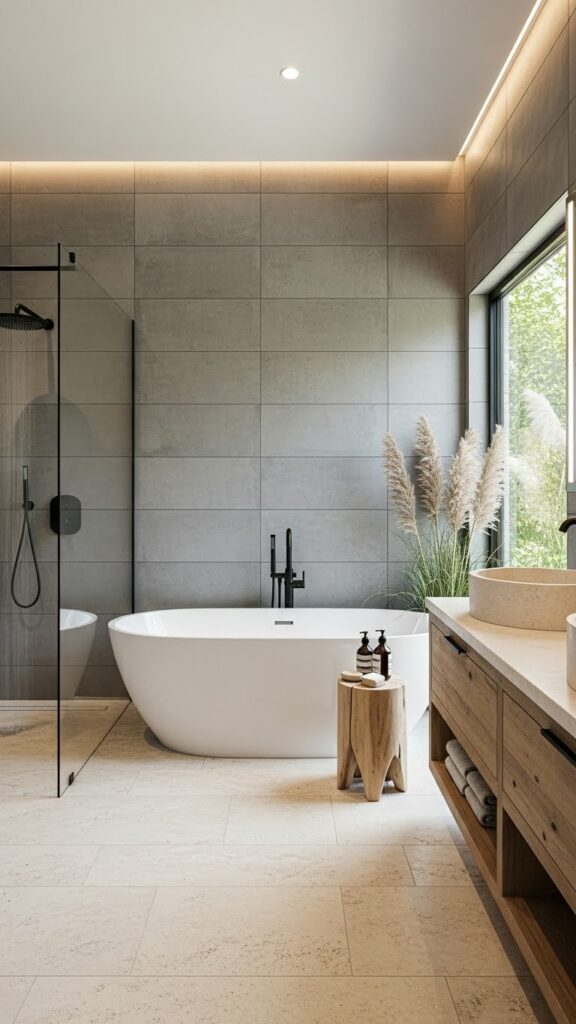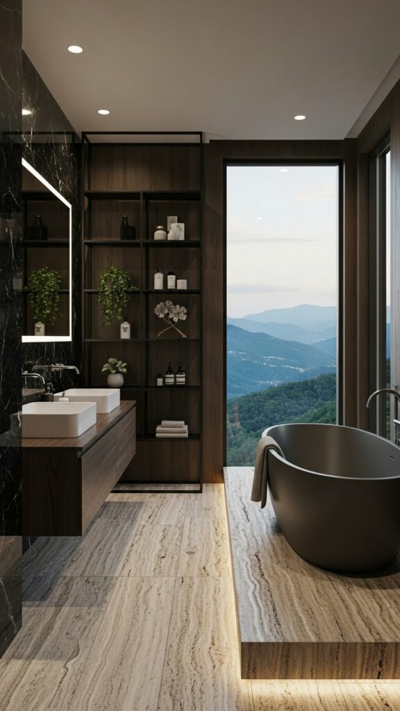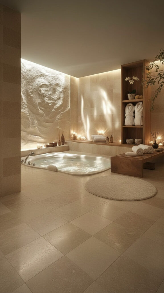 - Floor-to-Ceiling Tile: Large format marble or travertine.