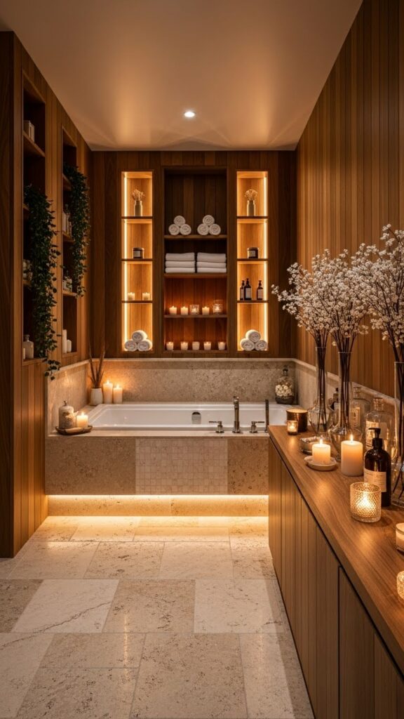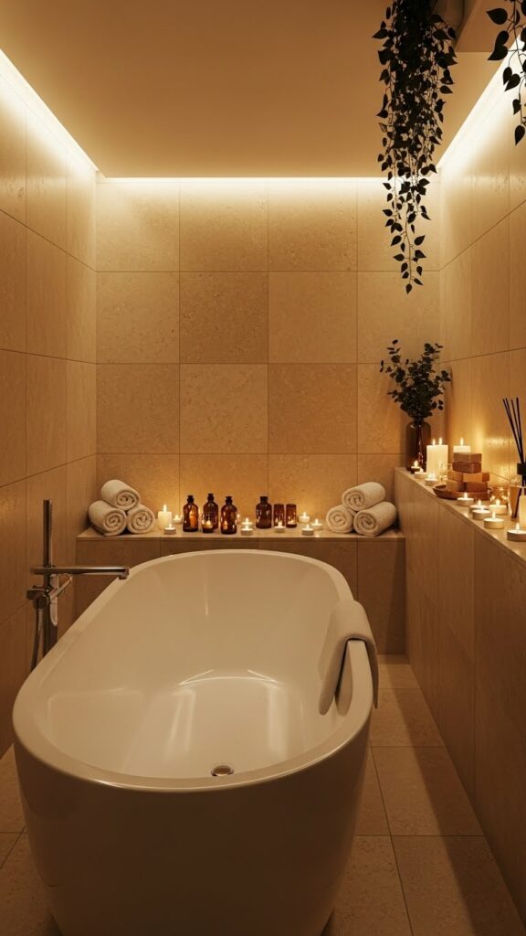 Harsh lighting is the enemy of relaxation. You must banish the “hospital glare.” Spa bathroom ideas rely heavily on dimmable, layered light.