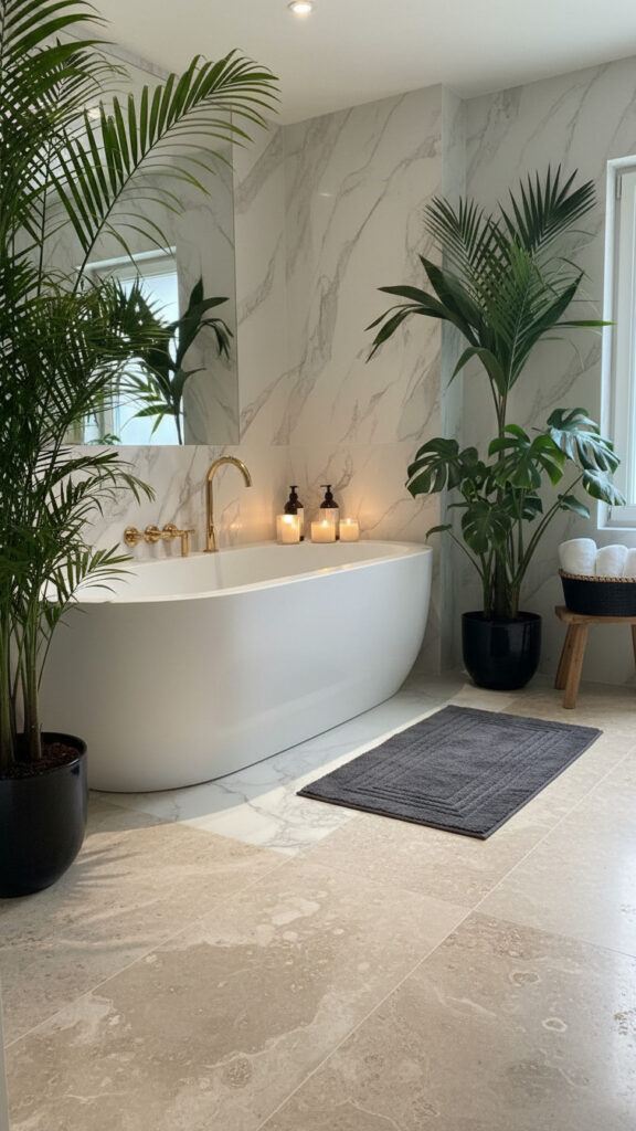 - Living Plants: Large Monsteras or ferns that thrive in humidity.