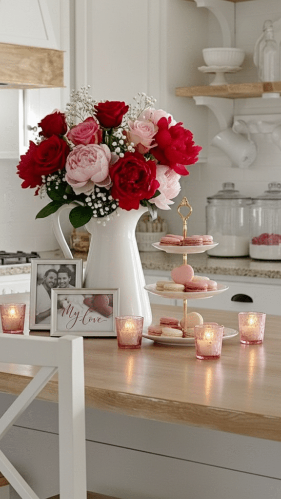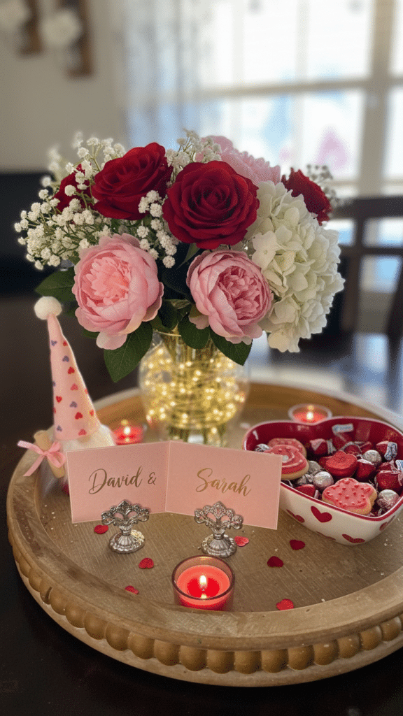 Fill the tiers with a Tiered Tray Decor Set featuring mini signs and faux greenery. It is a contained vignette that adds Valentine’s Day aesthetic without wasting counter space.