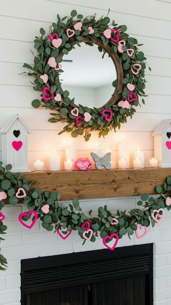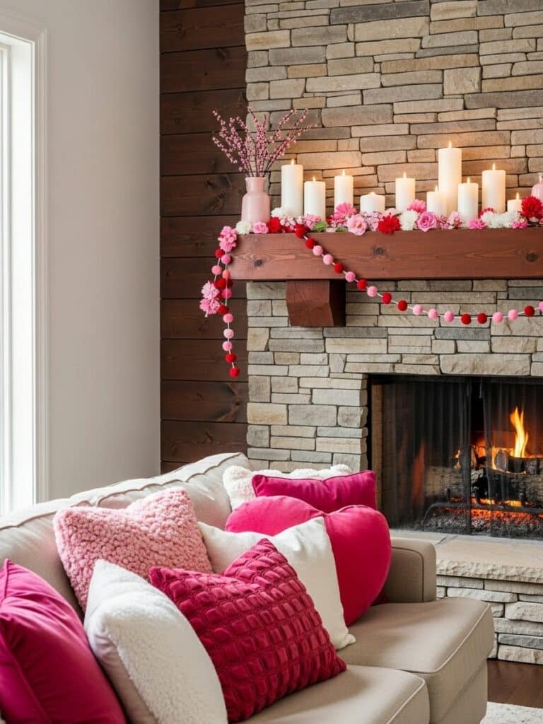 Layer a seasonal mantel display with a Felt Ball Garland (Pink/White) or lush greenery. Mixing textures here creates a cozy and inviting visual anchor for the living room.