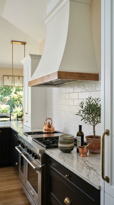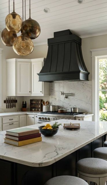 Dark metals bring profound sophistication to a modern culinary space. The striking visual weight of a dark canopy contrasts brilliantly with bright marble countertops.