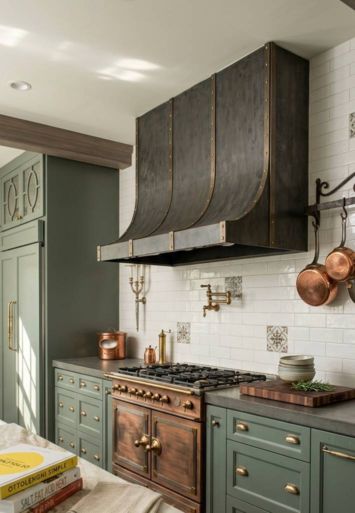 An Antiqued Brass Repoussé Vent Canopy functions as the crowning jewel of a highly curated space. The warm, golden patina adds undeniable historical depth.